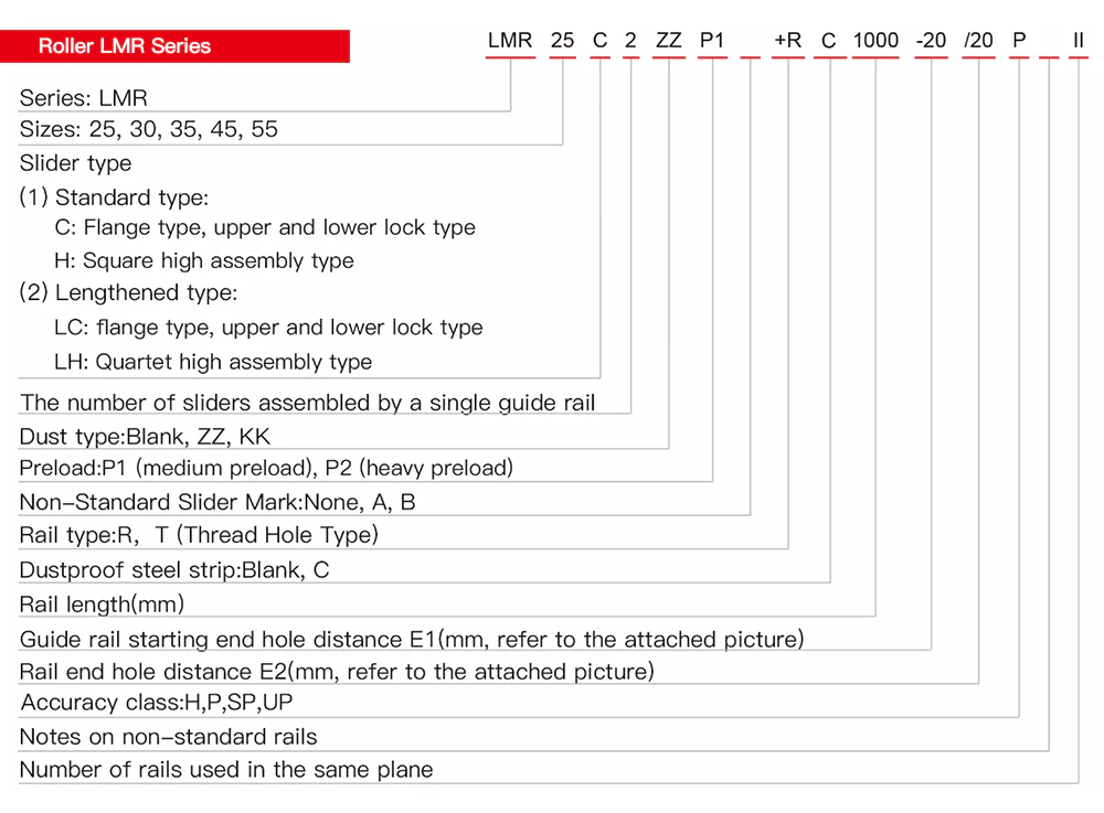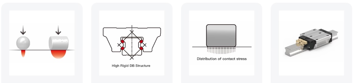 The LMR series linear guide uses cylindrical rolling elements instead of traditional steel ball rolling elements, changing from point contact to line contact, greatly improving the load capacity. When bearing high loads, the elastic deformation of the cylindrical rolling element is smaller. The four cylindrical columns are designed with a 45-degree contact angle DB, providing high rigidity and load-bearing performance. It can also withstand equal loads in radial, anti-radial, and left-right lateral directions.