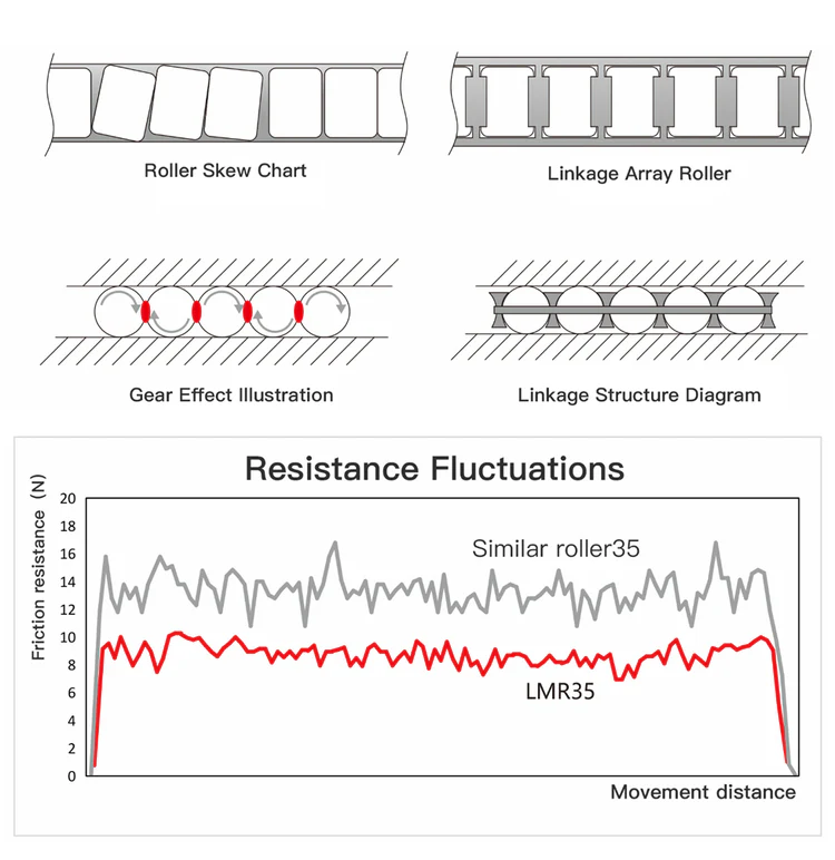 | Smooth Motion Optimized design to each component, each roller is evenly aligned by the roller linkage, solving the unique rolling slope problem of the roller, and eliminating the cogging effect of the rolling body to reduce the rolling resistance to the limit, thus achieving the best running quality. The LMR series linear guide also has a specially designed cylindrical roller joint built-in to remove the gear effect caused by the mutual friction of the cylindrical rollers during rolling. This greatly reduces the walking resistance, improves the smoothness of operation, and achieves the effect of reducing noise. | ![]() |